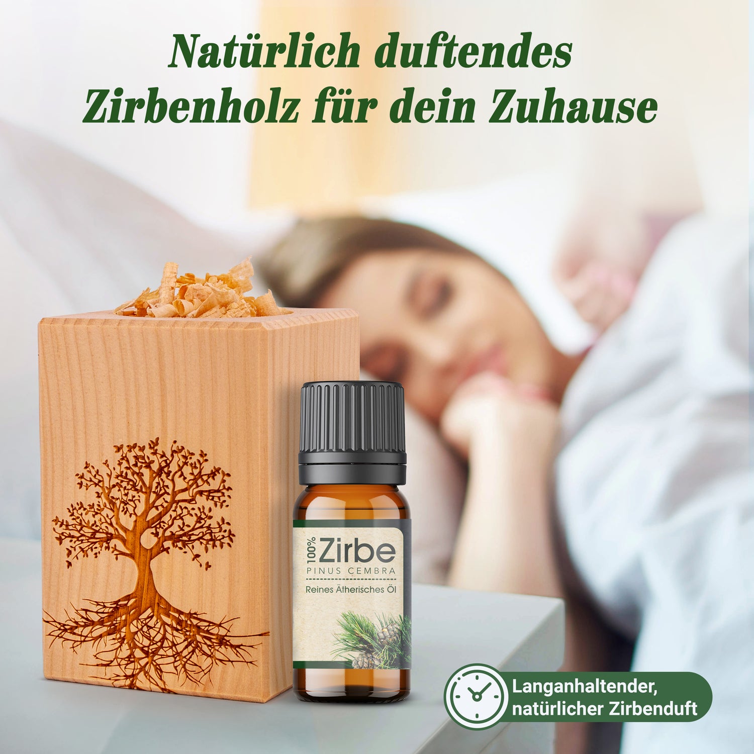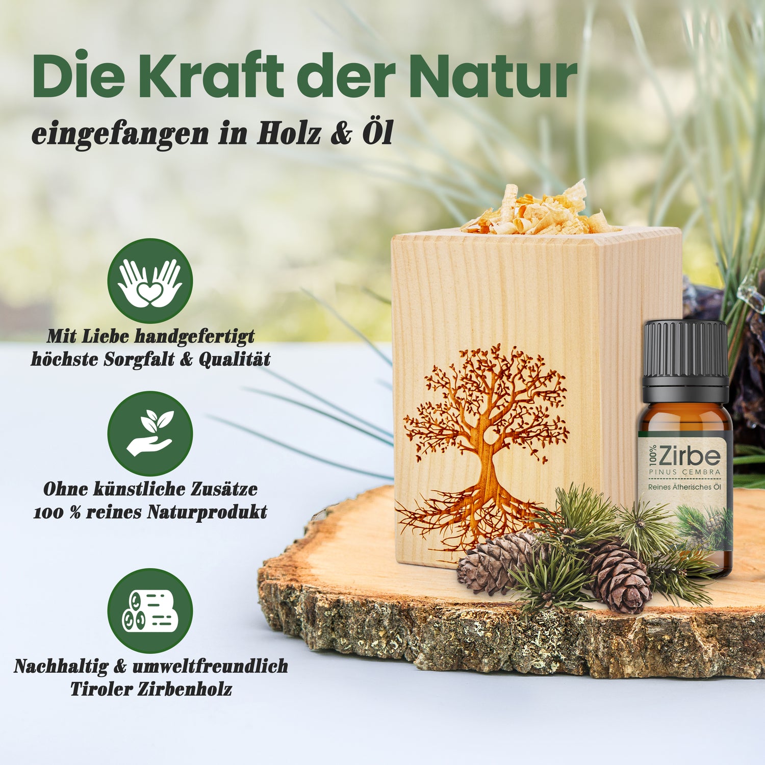 Dieses hochwertige Duftset ist nicht nur eine außergewöhnliche Dekoration sondern schafft auch noch eine tolle Athmosphäre. Nur wenige Tropfen des Öles auf die Zirbenspäne träufeln genießen.
