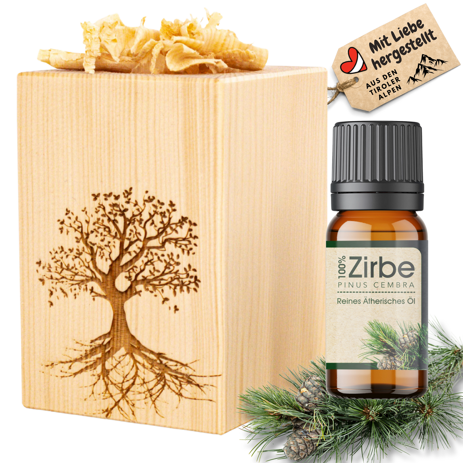 Das Set besteht aus unserem Zirbenöl und einer kleinen Zirbensäule mit einem Loch in der Mitte, welches mit den beigelegten Zirbenspänen gefüllt wird.